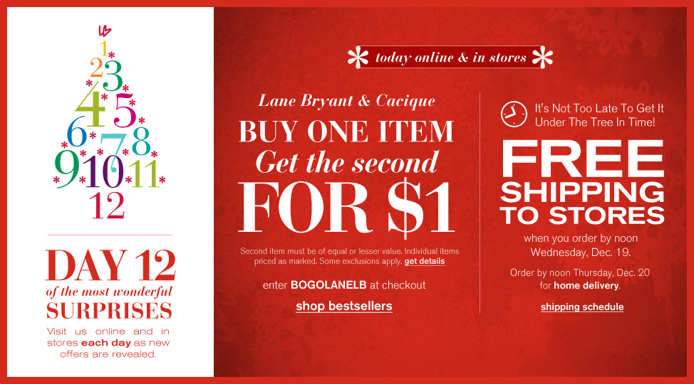 And don’t forget! Lane Bryant’s “12 Days of the Most Wonderful Surprises” is still going on now until December 16! You can unlock a new surprise offer every day on the Lane Bryant Facebook page. It’s the perfect way to get your favorite must-have fashion items for the holiday season, at great prices.