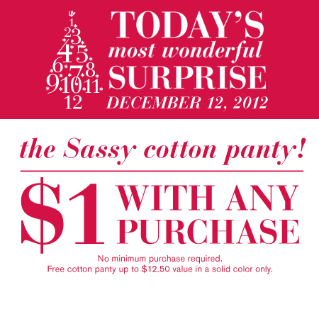 Lane Bryant has made made your holiday shopping so simple this season, with their 12 days of Β suprises! Β Right now until β 16th, Lane Bryant is offering 12 Days of Surprise Offers for all their customers, in store and online.Β Each day there is a different offer, and I know youβll see that some are too good to pass up. Today’s suprise isΒ Sassy cotton panty $1 with any purchaseΒ In store and online (Sold Colors only.)