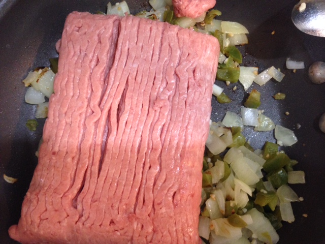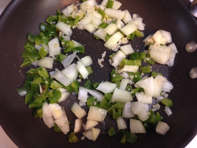 2. Dice onion and green pepper into small pieces and add to heated skillet with garlic. Cook onion and pepper just until soft.